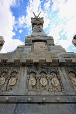 Eso explica que el mausoleo se destaque sobre todo por su verticalidad y monumentalidad. Este se yergue, a manera de obelisco, desde el centro de un imponente sarcófago de mármol. Agustín Querol, el escultor español autor de la obra, flanqueó la base del monumento con cuatro figuras alegóricas: “El Dolor,” “La Abnegación,” “El Heroísmo” y “El Martirio” (todas representadas por figuras femeninas). En la base del monumento podemos ver las representaciones realistas de los bomberos que perecieron en el siniestro. La cúspide está rematada por otra figura alegórica, alada que, mientras con un brazo señala a las alturas, con el otro sostiene por la cintura el cuerpo de un caído.