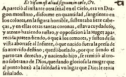 Otra representación de lo monstruoso en su relación de lo sagrado lo tenemos, asimismo, en algunas representaciones de la Virgen, especialmente el caso de la Virgen de Guadalupe. Es precisamente el libro Imagen de la Virgen María madre de Dios de Guadalupe […]de Miguel Sánchez (1594-1674) donde se hace explícita la asociación de la Virgen de Guadalupe con la mujer del Apocalipsis (imagen 11). Es en México, el nuevo Patmos, donde la Virgen o segunda Eva recibe las alas de águila para poder