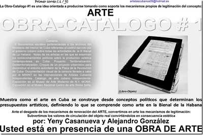 El absurdo de la historia de Monte Rouge y los eventos que este cortometraje desencadenó resultan poca cosa cuando se confronta con los intríngulis del proyecto Obra-Catálogo #1, de Yeny Casanueva y Alejandro González. Obra-Catálogo #1 es un archivo digital distribuido a través del correo electrónico que contiene diversos informes de agentes de la Seguridad del Estado en torno a las actividades de Casanueva y González, junto con material relacionado con la producción de estos artistas, específicamente sobre sus actividades y contactos en la Bienal de Artes Plásticas de La Habana. Los documentos policiales llegan a mano de Casanueva y González luego de que el agente Douglas, uno de los encargados de vigilar sus actividades artísticas, les entregara “un dispositivo de memoria digital para que le copiaran en él imágenes de obras suyas” (38). Casanueva y González obedecen la orden, no sin antes apropiarse de todo lo que contenía la memoria USB del agente Douglas. El hallazgo permitió a los artistas descubrir, entre otros archivos de inteligencia, los ocho documentos que integran su propuesta artística digital.