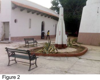 Fair in Cuba wherein Russia was the guest of honor. On the grounds of the Morro Castle and La Cabaña Fort, unique material installations in the form of replicas (as opposed to ruins) took temporary root. Perhaps none was comparable to the unusually placed replica of a kind of rocket from the CCCP (the acronym for Soyuz Sovetskikh Sotsialisticheskikh Respublik or the USSR) that contained within a photograph of the cosmonauts Arnaldo Tamayo and Yuri Romanenko (fig. 1). This ambiguous object (fig. 2) was positioned in the back of the “Russian”–themed restaurant on the fairgrounds and within the visual panorama of the crosses of a number of churches. Had this replica of greatness and solidarity been situated more centrally, it could have been a major highlight of the theme park.